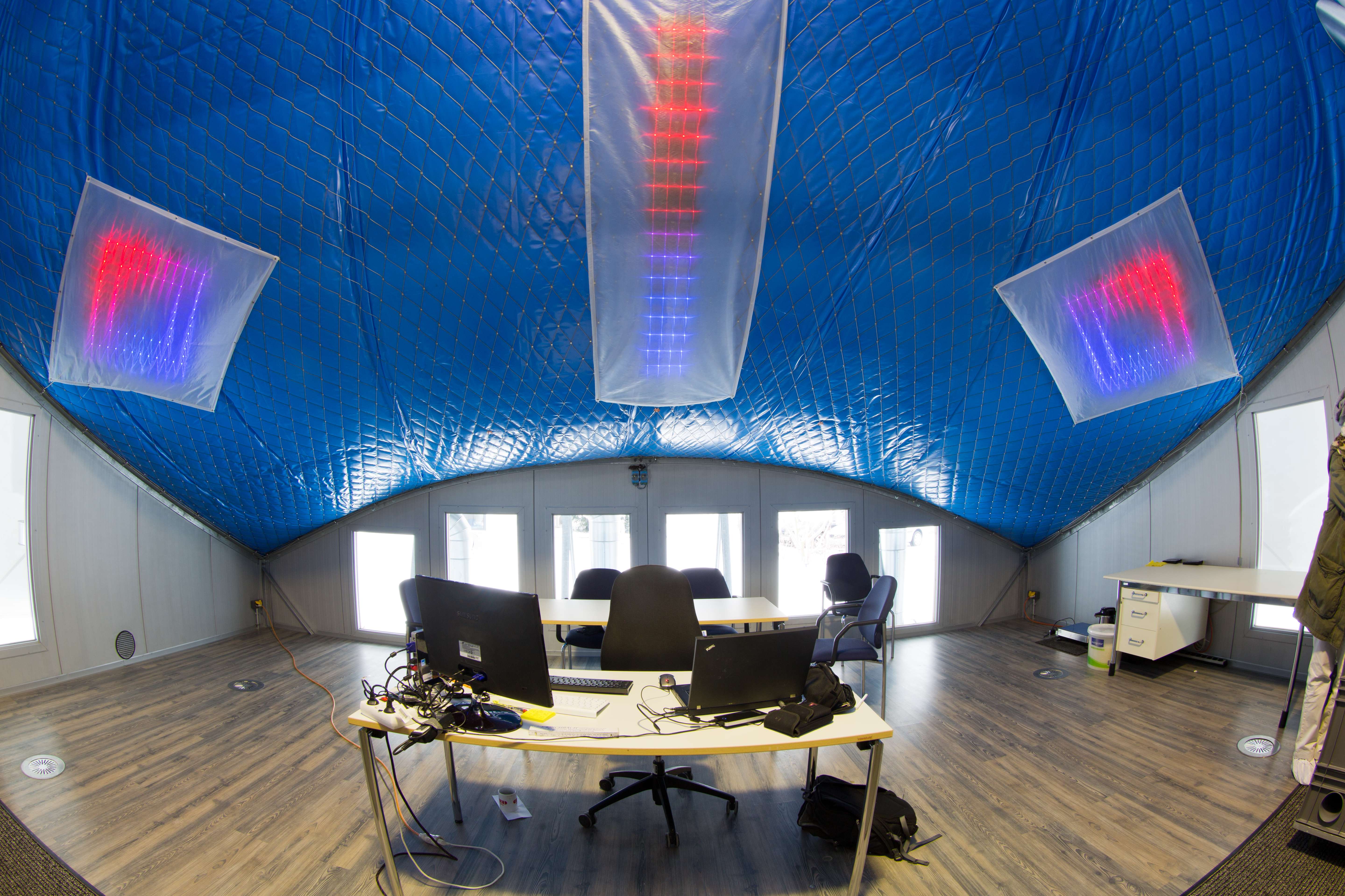 Hinter diesem neuesten Hightech-Wahrzeichen „in“ Textil stehen sechs Forschungspartner unter Federführung des Instituts für Textil- und Verfahrenstechnik (ITV) in Denkendorf. Der energieautarke Pavillon für ganzjährige Nutzung besitzt neuartige textile Solarkollektoren aus mehreren Membranschichten, die eine hohe Wärmeisolation aufweisen. Vorbild dafür ist das Funktionsprinzip, das die Textiler der Natur – in diesem Fall dem Eisbärfell – abgeschaut haben: Einfallendes Sonnenlicht trifft auf ein schwarz beschichtetes Textilgewebe und eine hoch poröse Membran mit Wärmetransportschicht, die für die Erwärmung der durchströmenden Luft sorgen. Warme Sommerluft gelangt so in ein Langzeit-Speichersystem mit Silikagel, in dem sie bis in die Winterzeit hinein „gelagert“ wird. Eine weitere Schicht in der Gebäudehülle hingegen sorgt für eine hohe Wärmedämmung nach außen – zuständig für das Fernhalten der Winterkälte.